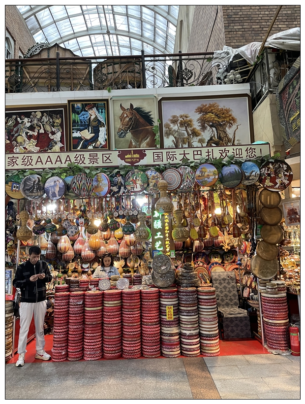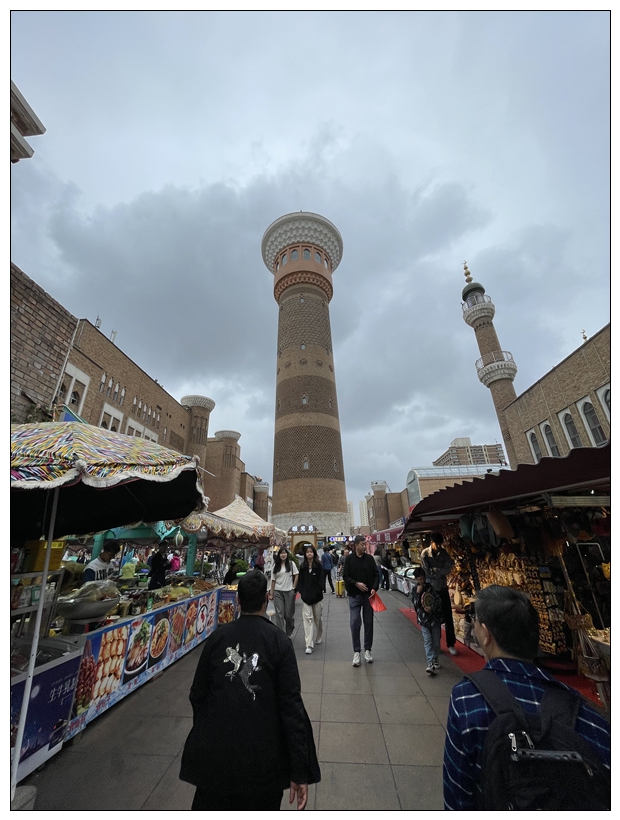 大十字距离南门很近,在南门广场,远远就能看到汗腾格里清真寺的穹顶。因为找厕所去了附近的新华书店,看到了好玩的事情,只是书店不让拍照。书店一楼开了家奶茶店,叫阿凡提奶茶。点了奶皮子咸奶茶,18元,温热,味道很特别,也很好喝。拿着奶茶继续出发,路过陕西大寺,大门紧闭。继续走,边走边纠结着是否要午饭。说话间就来到新疆民街附近。新市路和胜利路十字路口有很多本地餐厅和小吃。开在路口的胡祖如穆美食馆人气爆棚。路过看了看,全是本地人。犹豫再三没进去,旁边小店买了烤包子,继续赶路。包子不怎么好,还没吃完就抬头看到新疆民街。沿胜利路向南百十来米,到了新疆民街跟前,大大的布告,装修。这时确实有点饿了。龙泉街的谢热富烤包子店买了肉馕,10元,可真是好吃。站大街上炫到饱。这里距离大巴扎就很近了。进到大巴扎不一会,就开始零星有点小雨。速速逛了逛,玉雕和英吉沙小刀印象深刻。