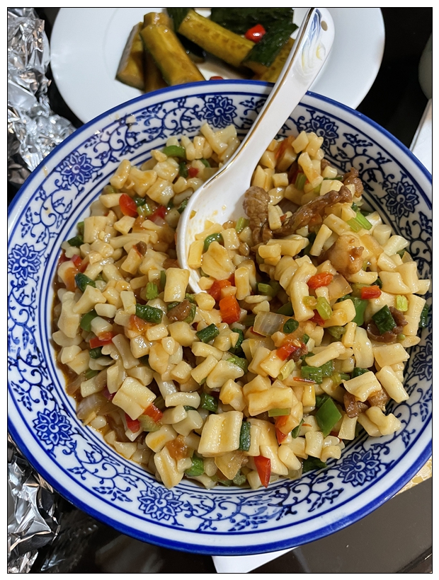昆仑宾馆的早餐丰富,各种特色小吃,做得也好。椒麻鸡是这次新疆之行最好的。吃完饭,准备宾馆外面散散步。前台服务员好心告诉我们院子有很多苹果树,果子可以摘。我们好奇地去看,果子还青。果树就在路边,我说这果子放在西安活不过一周。