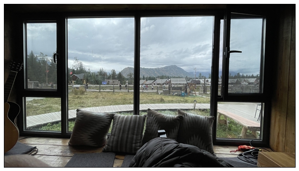 小巴沿着喀纳斯河逆流而上,两边是嫩绿带着鹅黄的桦树,有那么一瞬间,厚厚的云层开了个口子,阳光从缝隙洒向喀纳斯河,波光映射着河间的白雾,照亮了黄黄屡屡的桦树。开小巴的老司机熟视无睹,开得飞快,车上广播介绍着沿途的风景,等广播结束的时候,小巴也停靠在了喀纳斯景区换乘中心。这里是喀纳斯老村和新村的交接处,从这里往东面去1km左右的山腰上就是这次预定的酒店阅湖服务中心。酒店派了车来接,却左等右等不来。又下着雨,湿冷的天像快要入冬。只能一边踱步一边东张西望。