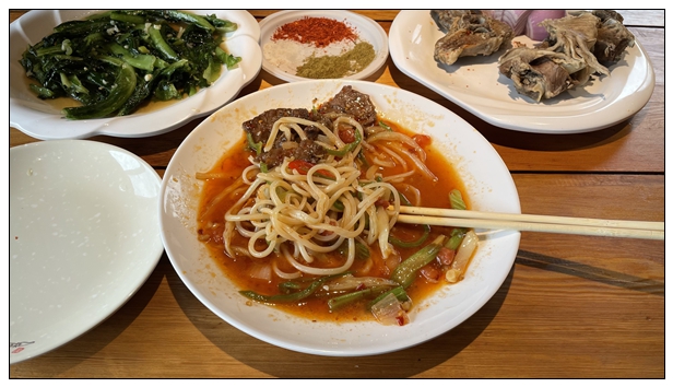 办好入住,先休息补了会觉。这几天睡太少了。随后抓紧时间乘车去最近的神仙湾。太饿。呆了一会回来吃饭。换乘中心商业气息很浓,辗转再三,最后在老村儿的优哉游哉吃午饭。优哉游哉是开在老村的民宿,它的餐厅就在院里靠近马路的一侧,里面的装修像很文艺的酒吧,靠近马路的这边是一扇极大的玻璃窗,正对着山顶的观鱼台。我们点了油麦菜,手抓肉,家常拌面。在景区里来说,这顿饭虽然有点贵,但也着实不错了。