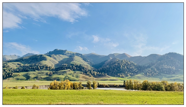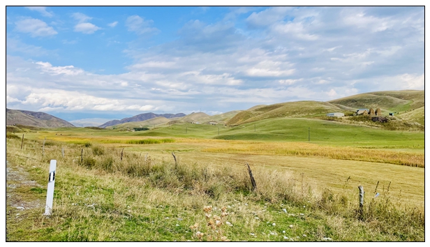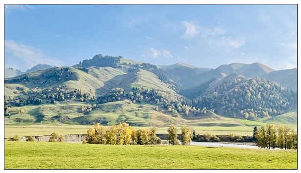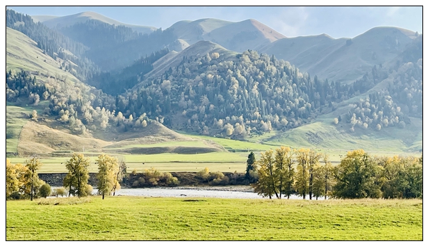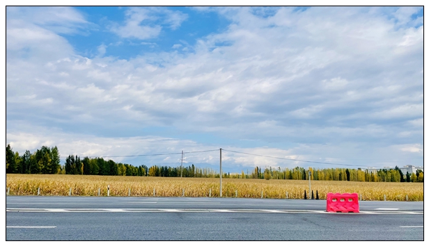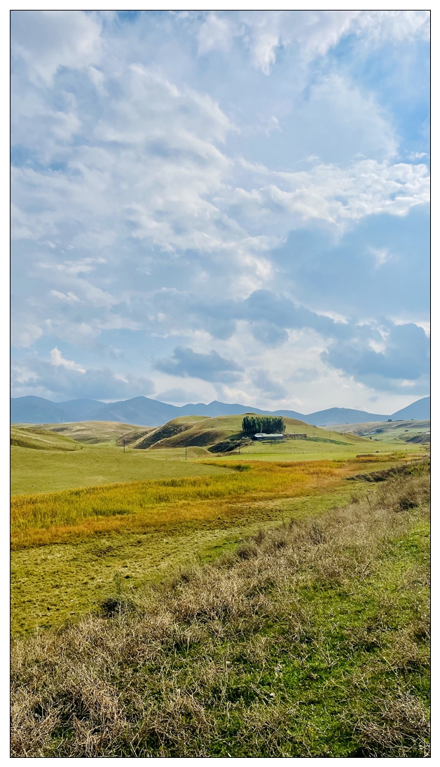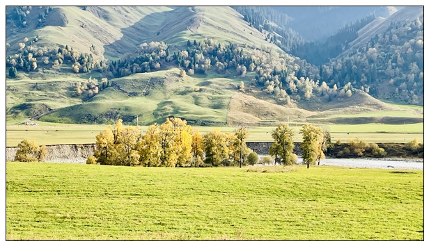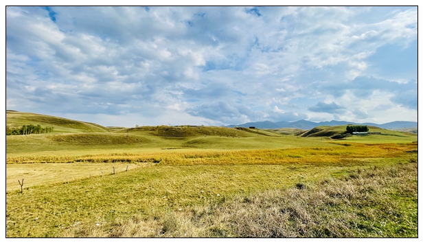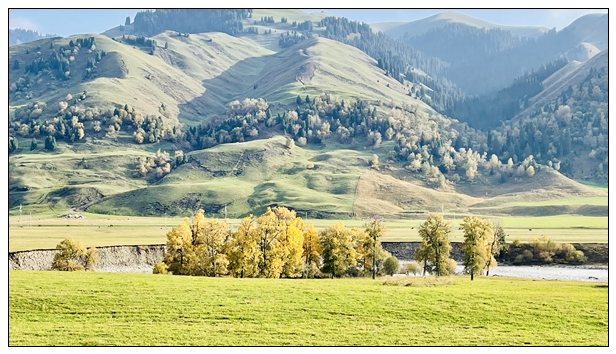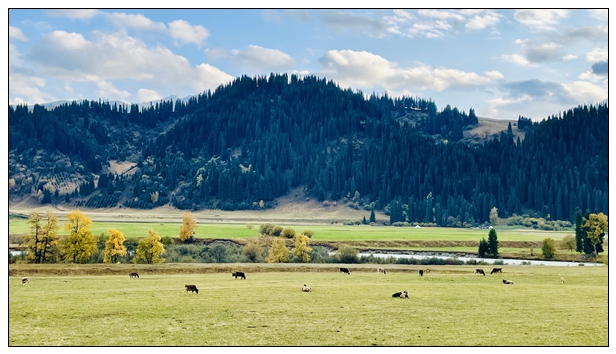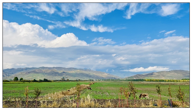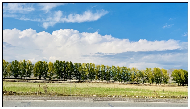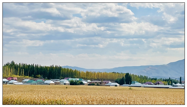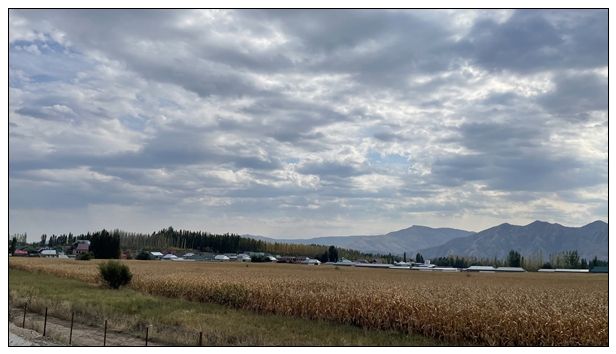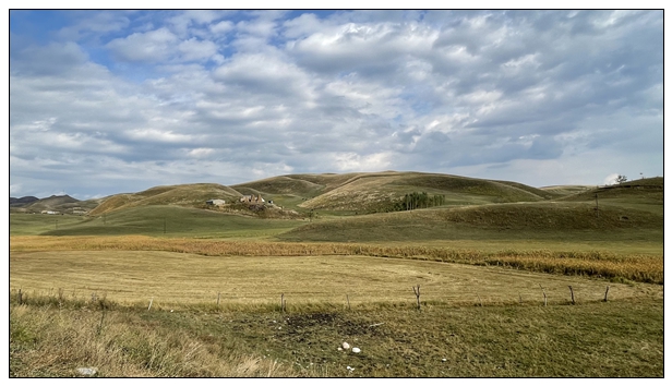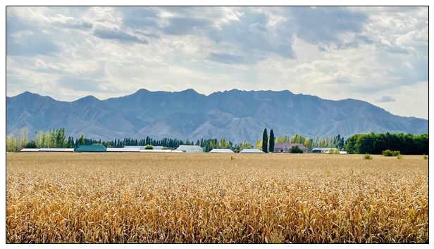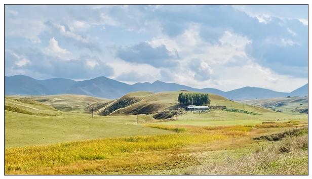 沿途景色随着地势起伏各不相同。有大片大片的青贮玉米田,有大片大片开始泛黄的杨树林,有绵延不断的山,山脚下弯弯的河。就伴着一路风景,走过一个又一个村庄。有时在遇到一群牛,有时遇到一群羊。甚至有一次,在停车等待羊群过去的时候,肥肥的绵羊对着后视镜来了一下子,直接合上了后视镜。