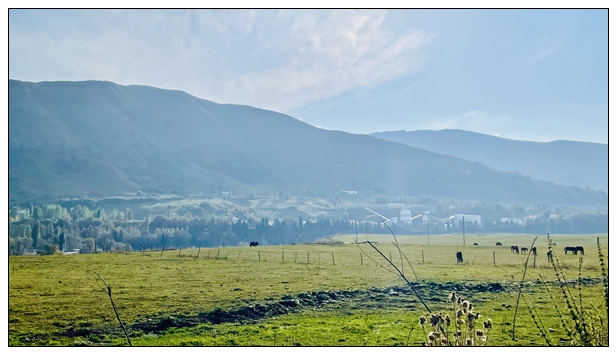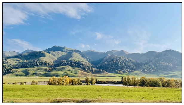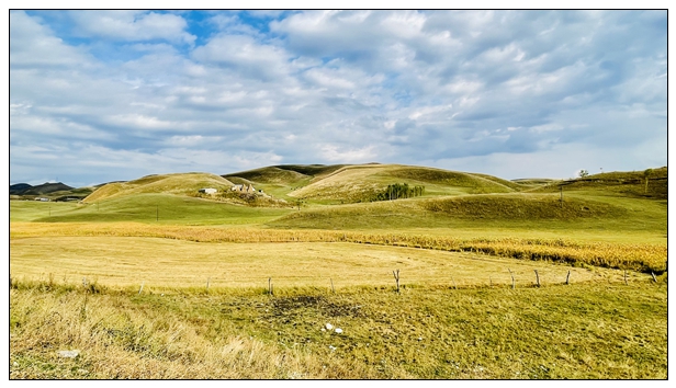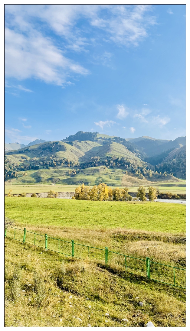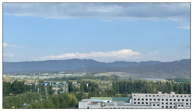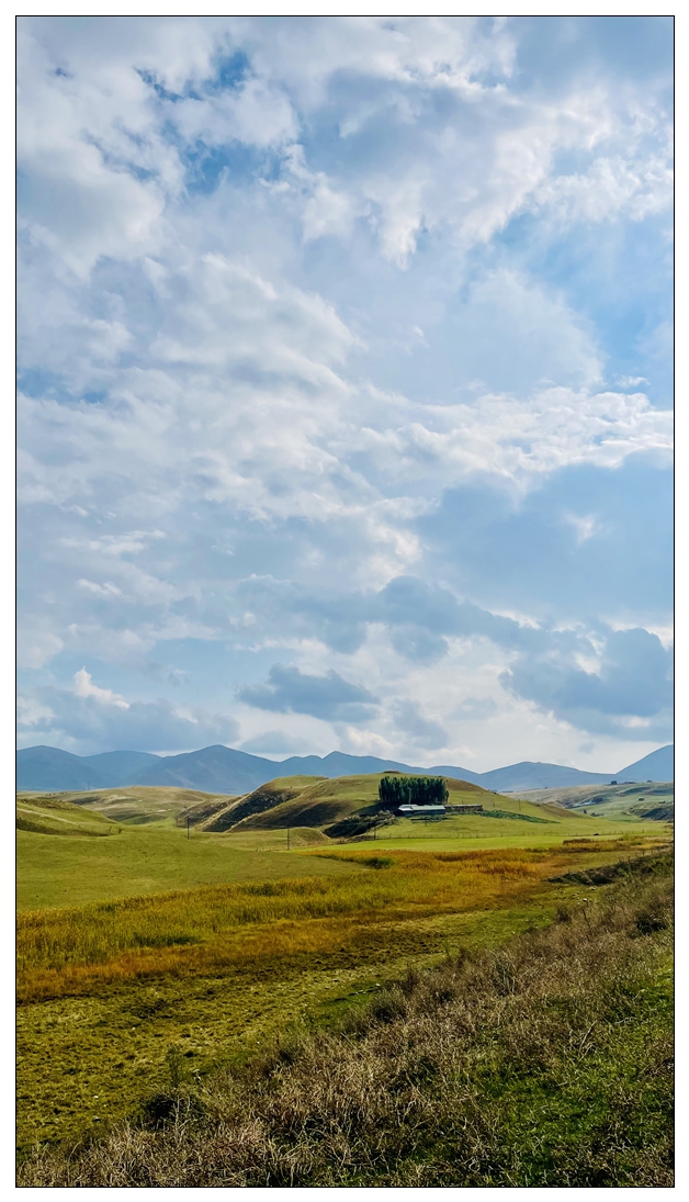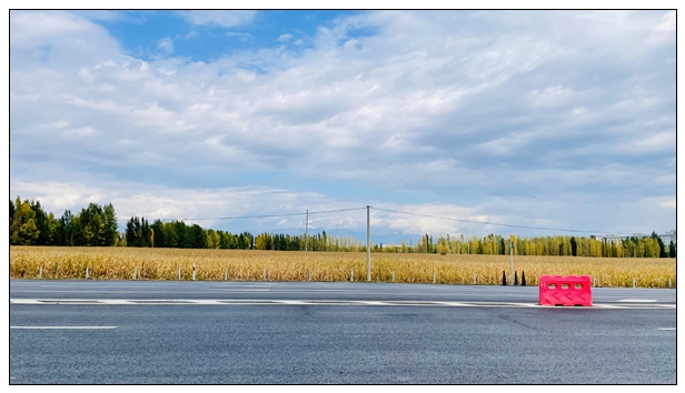 沿途景色随着地势起伏各不相同。有大片大片的青贮玉米田,有大片大片开始泛黄的杨树林,有绵延不断的山,山脚下弯弯的河。就伴着一路风景,走过一个又一个村庄。有时在遇到一群牛,有时遇到一群羊。甚至有一次,在停车等待羊群过去的时候,肥肥的绵羊对着后视镜来了一下子,直接合上了后视镜。